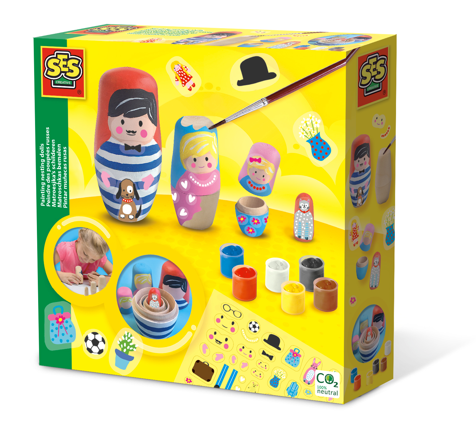 Czy słyszałeś o matrioszce, takich laleczkach, które są jedna w drugiej? Dzięki temu zestawowi SES Creative możesz stworzyć własną matrioszkę. Pomaluj je w swoich ulubionych kolorach i wykończ je w zabawny sposób naklejkami i akcesoriami. W ten sposób możesz stworzyć wesołą rodzinę laleczek! Dla dzieci w wieku od 5 lat