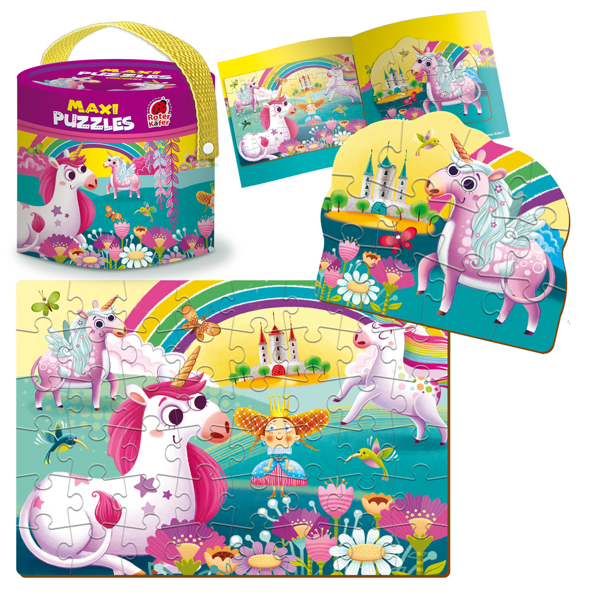 Puzzle w tubie. 2 zdjęcia przedstawiające jednorożce. Właściwości: oryginalne opakowywanie, mocna tekura. Zestaw: 48 i 15 elementów.