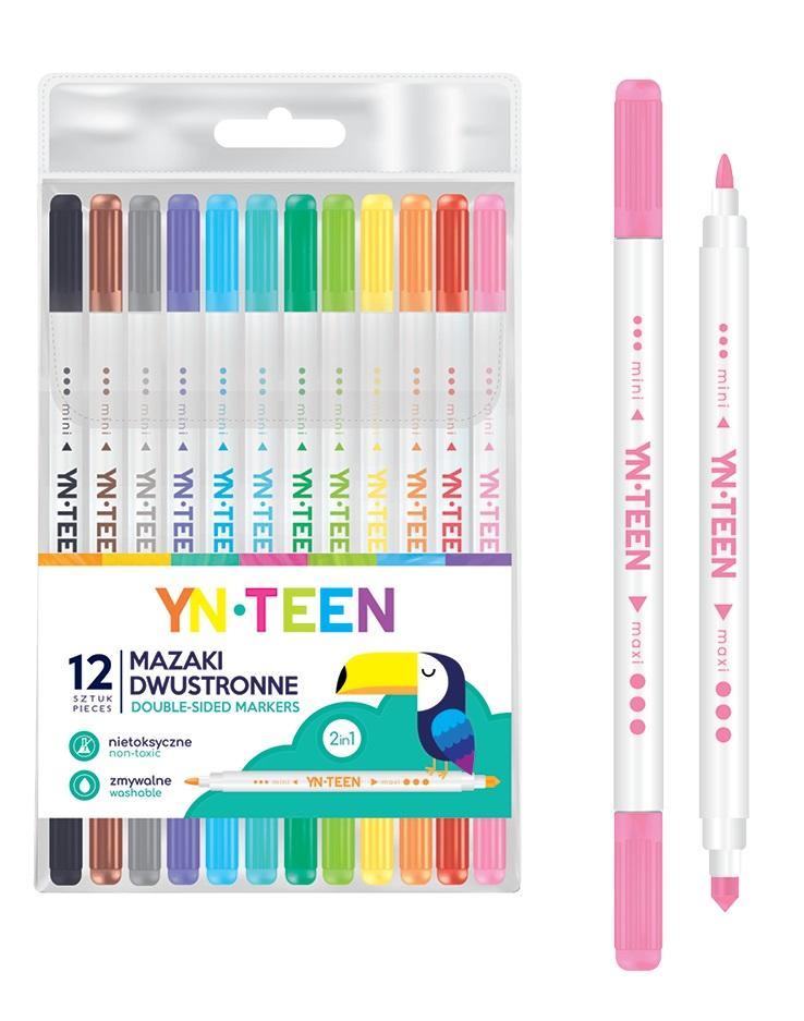 Mazaki dwustronne o dwóch grubościach końcówek w 12 kolorach. Nietoksyczne i zmywalne. Okrągły profil. Mają wentylowaną skuwkę.