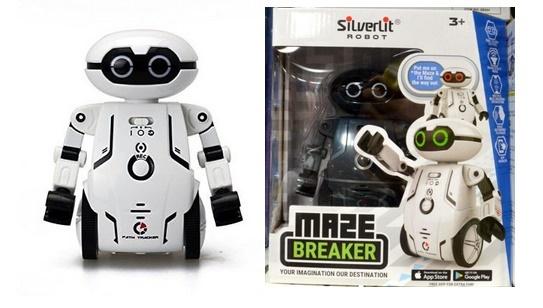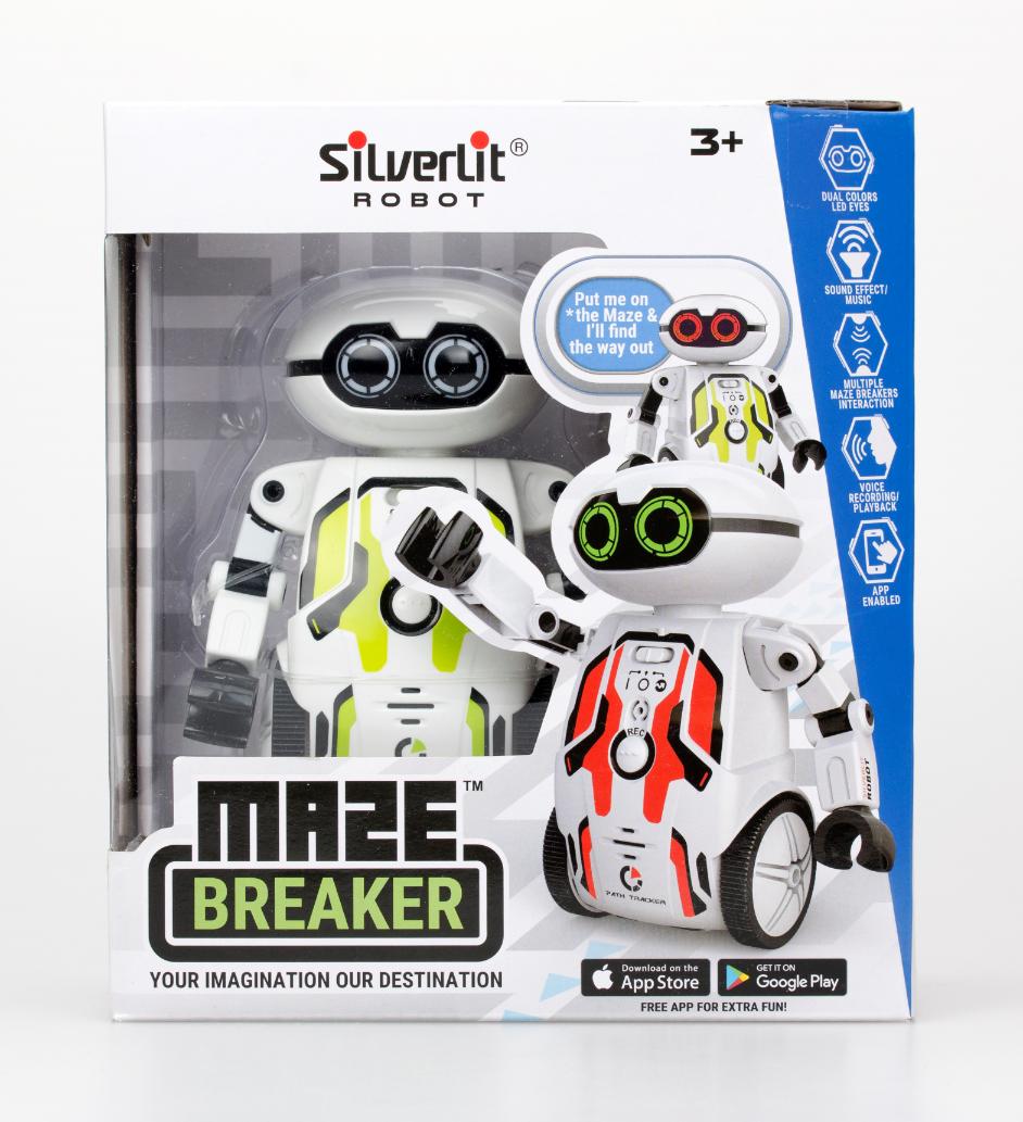 Maze Breaker to innowacyjny robot, który odnajduje drogę w labiryncie! Potrafi podążać za narysowaną czarną linią, pozostać wewnątrz zamkniętej pętli, a nawet tańczyć. Mów do niego, a Maze Breaker powtórzy Twoją wypowiedź głosem robota! Przekonaj się w jak różny sposób reaguje na sygnały dźwiękowe. Zabawka łączy się z innymi robotami Silverlit, a sterować możesz nią za pomocą telefonu. W skład zestawu wchodzi robot i plansza z labiryntem/ścieżką.