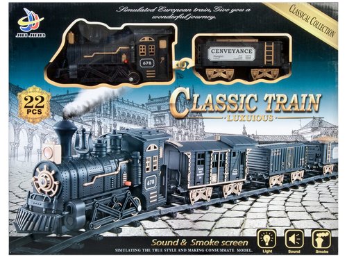 Lokomotywa podczas jazdy wypuszcza z komina dym i świecą się światełka. Zestaw zawiera: stację kolejową, lokomotywę z wagonem, 8x elementów torów, 4x drzewa, 6 różnych znaków kolejowych, szlaban. Produkt wykonany z plastiku. Przeznaczony dla dzieci powyżej lat 3. Wymaga zasilania bateriami 3xLR6.