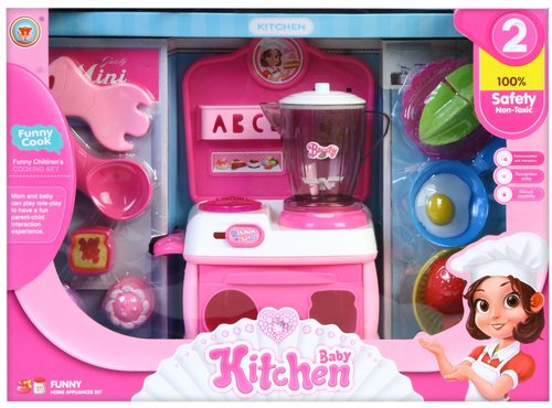 Zestaw zawiera wiele różnych potrzebnych akcesoriów kuchennych taki jak: kuchnia, blender, patelnia z  jajkiem, koszyczek na owoce, talerz. Kuchnia  w postaci sortera z klockami. Zestaw posiada efekty dźwiękowe oraz świetlne. Produkt wykonany z plastiku. Przeznaczony dla dzieci od lat 3 . Wymaga zasilania bateriami 2xLR6.