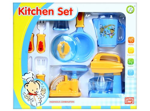 Zestaw posiada mikser, wagę kuchenną oraz 9 różnych akcesoriów niezbędnych w kuchni . Zestaw zwiera mikser, wagę szalkową, patelnię z pokrywką oraz ''usmażonym jajkiem'', solniczkę, kubek, 4 rodzaje sztućców. Całość wykonana z plastiku. Przeznaczony dla dzieci od: 3+.