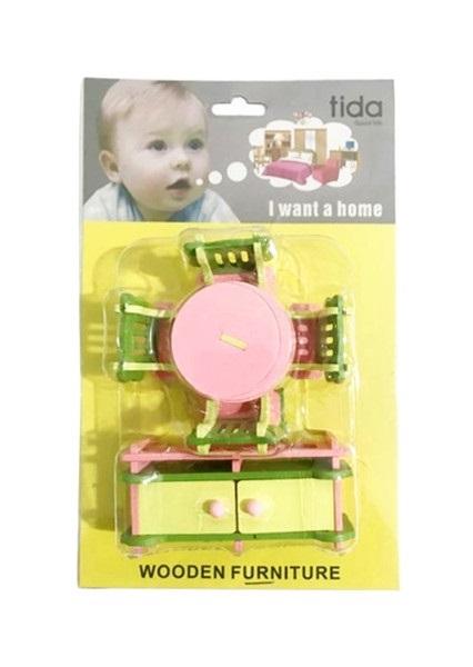 Drewniane mebelki dla lalek szafka, stolik z 4 krzesłami. Produkt zapakowany w kartonową podstawkę z przezroczystym kloszem.