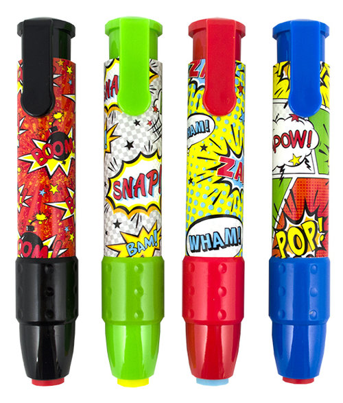 Wycieraj w stylu superbohatera! Z jednym kliknięciem powiesz NIE błędom ołówka, wytrzesz niepotrzebne jak prawdziwy bohater akcji. Bum! Pow! Mechaniczne Gumki do Ścierania Komiks są jednymi z najlepszych jednorazowych gumek poniważ są super zabawne i praktyczne (zamknięte w łatwej do trzymania plastikowej oprawie). Za pomocą kilku kliknięć masz gumkę, która jest gotowa na walkę z przestępczością (ponieważ niechlujny papier jest przestępstwem). Mechaniczne Gumki do Ścierania Komiks są dostępne w 4 stylach i kolorach. Tuba display zawiera 24 gumki, 6 z każdego koloru. Mechaniczne Gumki do Ścierania Komiks: Gumka mechaniczna w oprawie. 4 kolory i obrazki komiksowe na oprawie. Rozmiar displaya: 11,4 cm x 11,4 cm x 11,4 cm
