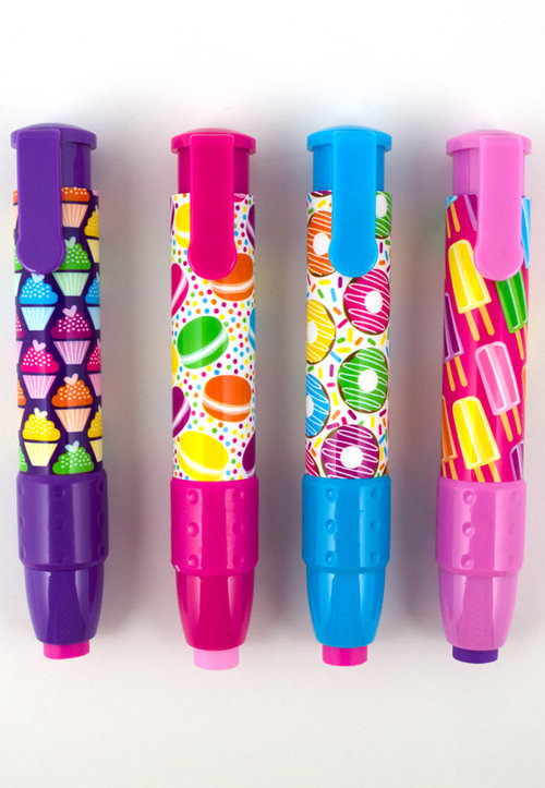 Gumki do ścierania ze słodkim akcentem. Co może być bardziej słodkiego niż lizaki, ciasteczka, babeczki i pączki? Mechaniczkne Gumki do Ścierania Słodycze to super zabawne i praktyczne gumki zamknięte w wytrzymałej, łatwej do trzymania plastikowej oprawie, która sprawia, że wycieranie ... jest naprawdę słodkie! Wszystko, czego potrzebujesz, to kilka kliknięć i jesteś na dobrej drodze do wycierania błędów ołówka przy pomocy słodko wyglądających gumek. Mechaniczke Gumki do Ścierania Słodycze są dostępne w 4 stylach i kolorach. Tuba display zawiera 24 gumki, 6 z każdego koloru. Mechaniczne Gumki do Ścierania Słodycze: Gumka mechaniczna w oprawie. 4 kolory i obrazki słodyczy na oprawie. Rozmiar displaya: 11,4 cm x 11,4 cm x 11,4 cm
