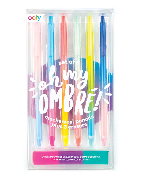 oh jakie śliczne! Zestaw 6 mechanicznych ołówków w tęczowych oprawkach i 3 różnokolorowe gumki do ścierania. Kolory oprawek ołówków mieszają się ze sobą w stylu ombre, gumki zaś mają jaskrawe kolory. Cały zestaw jest wprost prześliczny. Ołówki mechaniczne są fabrycznie napełnione 0,5mm HB 2. Ten tęczowy zestaw ołówków rozjaśni każdy szary dzień w szkole, biurze, domu.