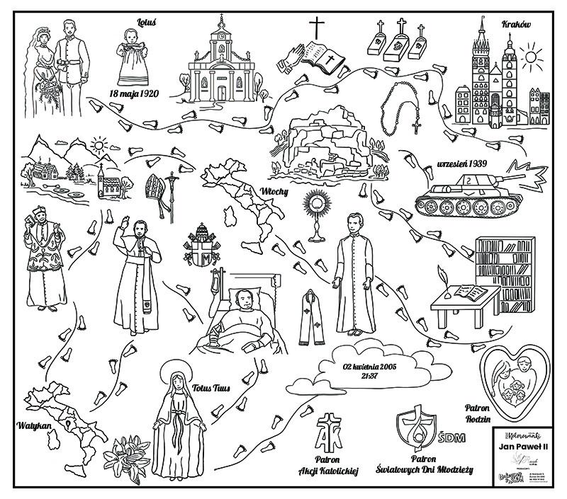 Poznaj życie Jana Pawła II razem z nami! Ta MEGA kolorowanka przyniesie wiele radości nie tylko dziecku, ale też całej rodzinie. Wspólne kolorowanie, to świetny sposób na spędzenie razem czasu i walkę z nudą. Kolorowanka Śladami św. Jana Pawła II przenosi nas w Jego świat.