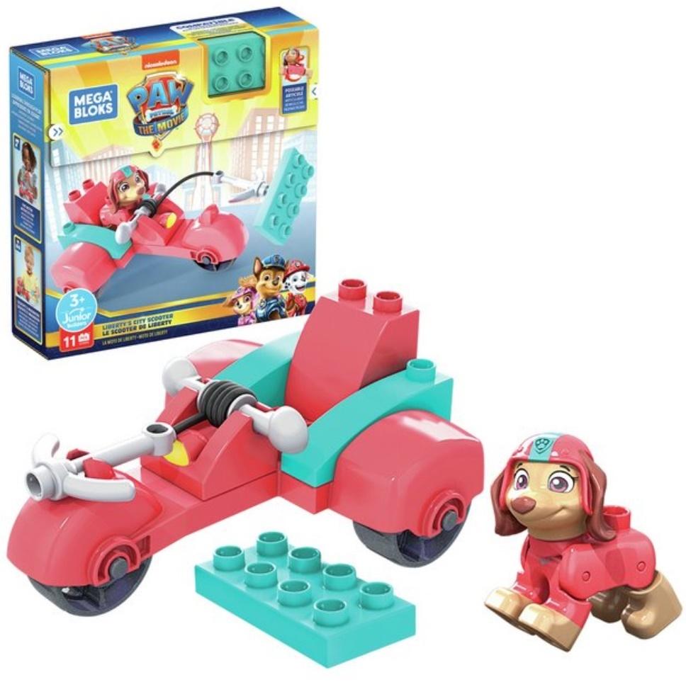 Zestaw konstrukcyjny inspirowany animacją ,,Psi Patrol Film"" zawiera 10 małych, wytrzymałych klocków wraz z elementami specjalnymi, które pozwalają zbudować skuter miejski Liberty z hakiem.