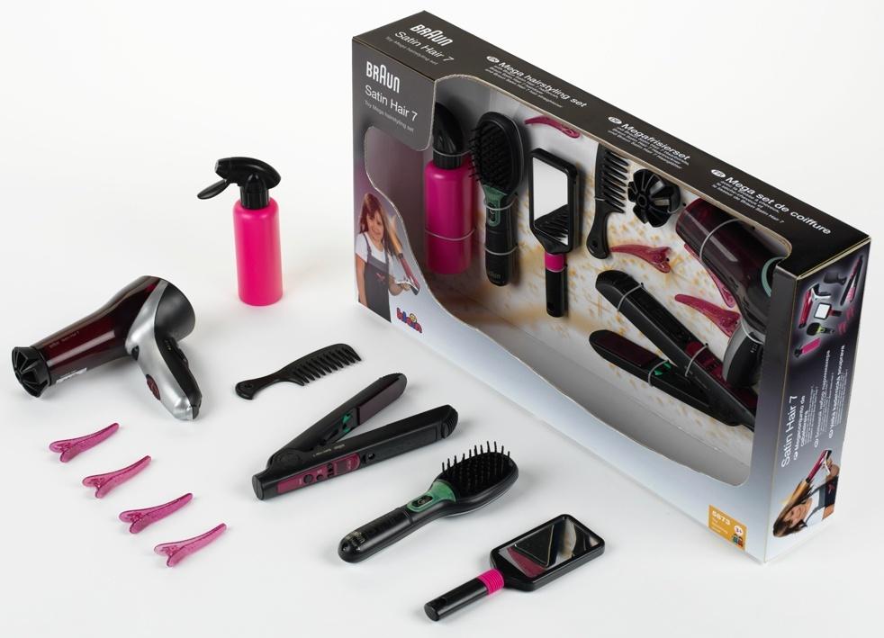 Ten fantastyczny i najbardziej okazały w ofercie zestaw fryzjerski na licencji Braun, jest nieodzownym atrybutem każdej małej fryzjerki. Dzięki niemu dziewczynka podczas zabawy może odgrywać rolę profesjonalnej fryzjerki. Żadne z urządzeń zestawy działających na baterię nie nagrzewa się na prawdę. Posiadają one jednak takie funkcje, że doskonale imitują prawdziwe urządzenia wykorzystywane w zakładach fryzjerskich. Wykonane identycznie, jak prawdziwe elementy z serii Braun Satin Care 7 z pewnością wzbudzą zachwyt każdej małej miłośniczki układania fryzur. W zestawie znajduje się suszarka do włosów z dyfuzorem, prostownica do włosów ze światłem imitującym nagrzewanie, szczotka do włosów z imitacją jonizacji, gdzie po włączeniu przycisku zapala się zielone światełko, spryskiwacz z pompką do którego można nalać wody, grzebień, lusterko, spinki do włosów - 4 szt. Zabawka została stworzona z myślą o dziewczynkach lubiących pielęgnowanie, suszenie i czesanie włosów. Zabawka jest nie tylko bezpieczna w użytkowaniu, ale sprawia również, że dziecko czuje się jakby korzystało z prawdziwej suszarki. Niemiecka firma Klein specjalizuje się w tworzeniu zabawek na licencji. Małe, plastikowe zabawki wyglądają niczym prawdziwe, elektroniczne urządzenia codziennego użytku. Zabawka wymaga użycia baterii, które nie są zawarte w zestawie.