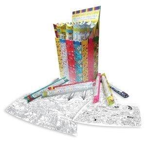 W kolorowym tekturowym etui dzieci znajdą olbrzymią zwiniętą planszę do kolorowania farbami, kredkami lub flamastrami. Po jej rozwinięciu będą mogły stworzyć wyjątkowe dzieło sztuki. Przed nimi mnóstwo radości i zabawy. Powstanie jedyna w swoim rodzaju kolorowa plansza o wymiarach 98x68 cm.