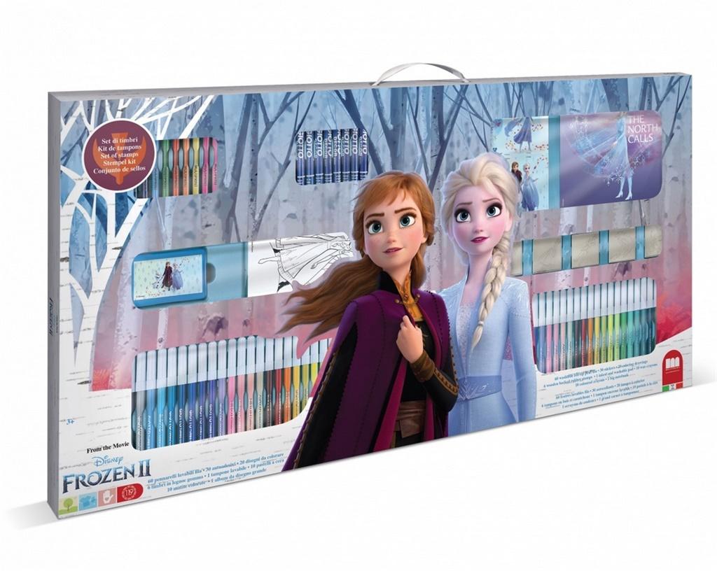 Megazestaw do kolorowania na licencji Kraina Lodu 2. Zestaw zawiera 6 pieczątek, 1 poduszeczkę do tuszu, 60 pisaków, 10 kredek ołówkowych, 10 kredek woskowych, 1 notatnik, 1 książeczkę do kolorowania i 30 naklejek.