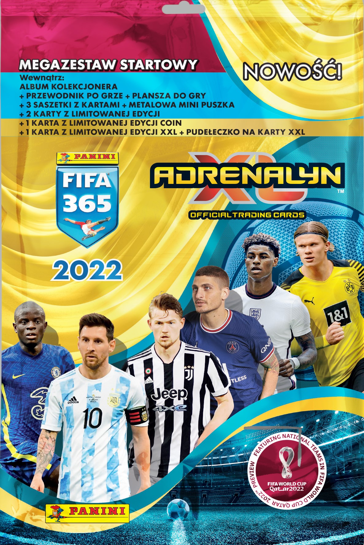 Mega Zestaw Startowy posiadający licencję FIFA zawiera album kolekcjonera, 3 saszetki z kartami, 2 karty z limitowanej edycji, 1 kartę COIN, 1 kartę z limitowanej edycji XXL, magazyn - przewodnik kolekcjonera, planszę do gry, metalową mini puszkę oraz pudełeczko do przechowywania kart XXL. Kolekcja PANINI FIFA 365 ADRENALYN XL 2022 to już siódma edycja kolekcji, w której wprowadzono wiele zmian: - łączna liczba kart w kolekcji wynosi 378, w tym ponad połowa będzie wydrukowana na wyjątkowych materiałach poligraficznych - 20 klubów z najważniejszych światowych lig krajowych + 6 reprezentacji narodowych jako zapowiedź nadchodzących Mistrzostw Świata FIFA Katar 2022 - każda drużyna będzie się składać z co najmniej 9 zawodników - gwiazdy zostaną przedstawione zarówno w strojach klubowych jak i reprezentacji narodowej.