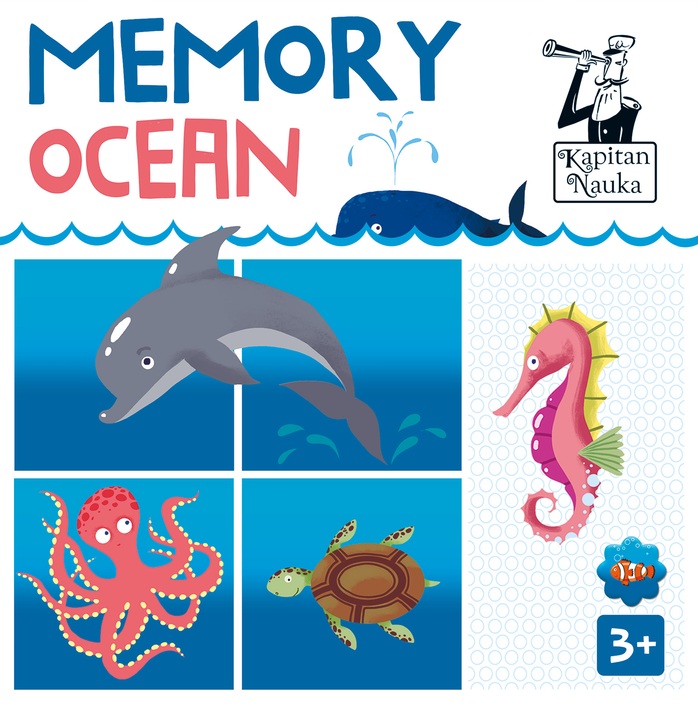 MEMORY OCEAN z serii Kapitan Nauka to świetny sposób na wspólną zabawę i doskonały trening pamięci. Składa się z 24 elementów i jest przeznaczone dla dzieci od trzech lat. Piękne ilustracje, narysowane przez Katarzynę Urbaniak są dodatkową atrakcją i zachętą do gry.