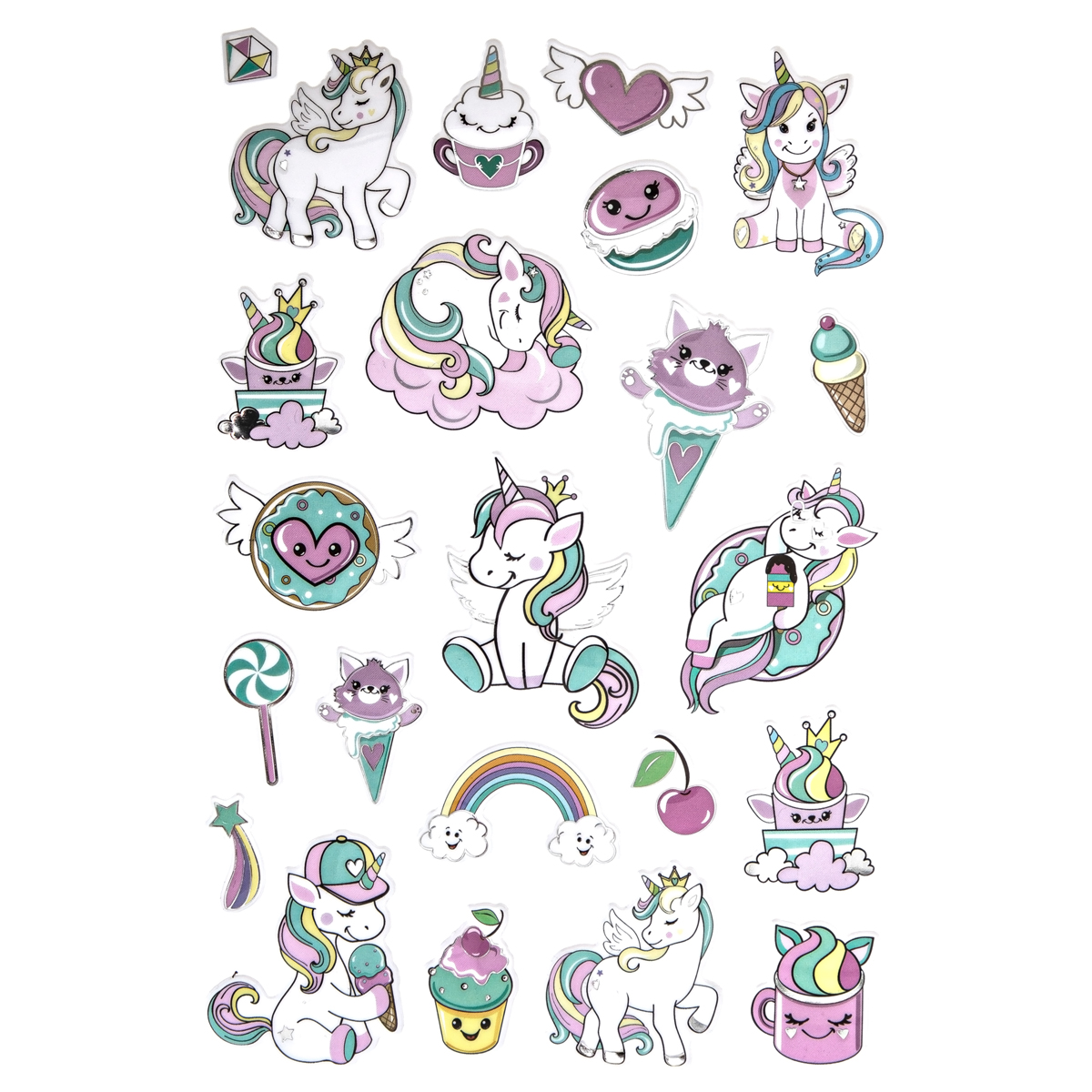 Kolorowe naklejki 3D z uroczymi jednorożcami, kotkami i słodyczami z pewnością wzbogacą wiele projektów kreatywnych oraz pobudzą dziecięcą wyobraźnię