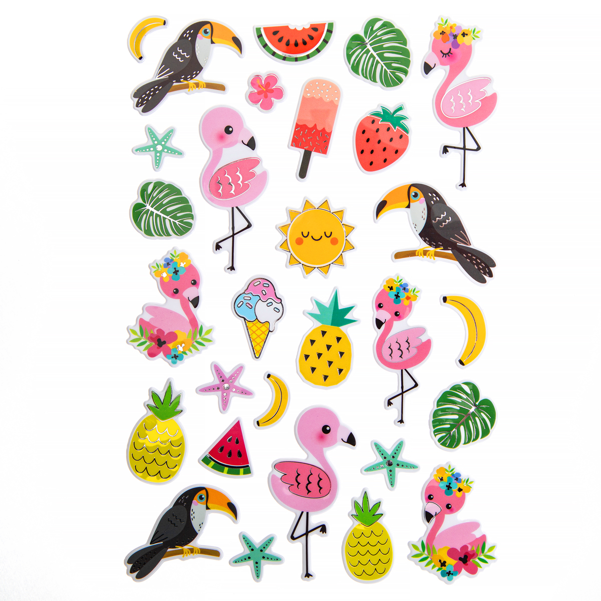 Kolorowe naklejki 3D z tropikalnymi motywami, to wyjątkowy produkt, który pobudzi dziecięcą wyobraźnię i wzbogaci wiele projektów kreatywnych.Wszystkie naklejki posiadają srebrne, metaliczne zdobienia, które pięknie odbijają światło. W dodatku są wypukłe i wykonane ze sztywniejszego materiału, a dzięki temu również odporniejsze na uszkodzenia.