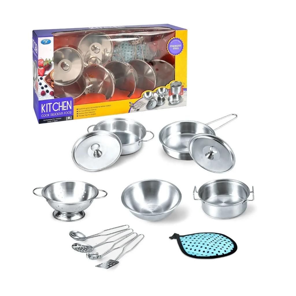 Zestaw naczyń, garnków metalowych dla dzieci z przyborami - 12 el.
