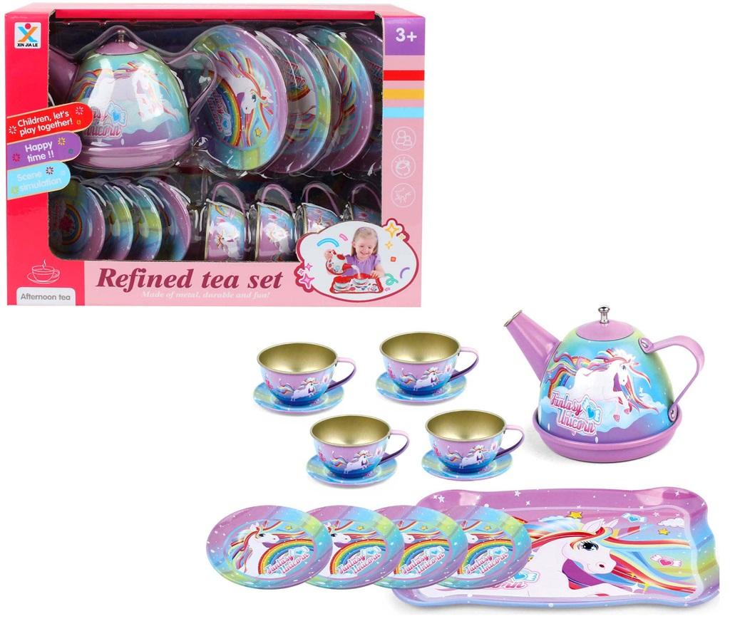 Śliczny, metalowy zestaw herbaciany z wizerunkiem tęczowego jednorożca. W zestawie 24 elementy: 4 filiżanki z podstawkami, 4 talerzyki deserowe, czajnik do herbaty i taca.