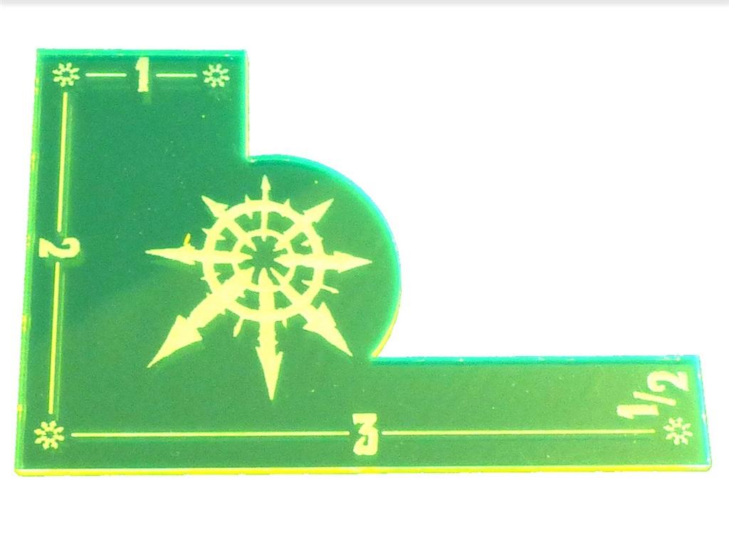 Miarka do gier bitewnych, przygotowana z myślą o Age of Sigmar. Na bokach miarki odłożono długości: 3, 2, 1, 1/2 cala.