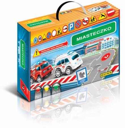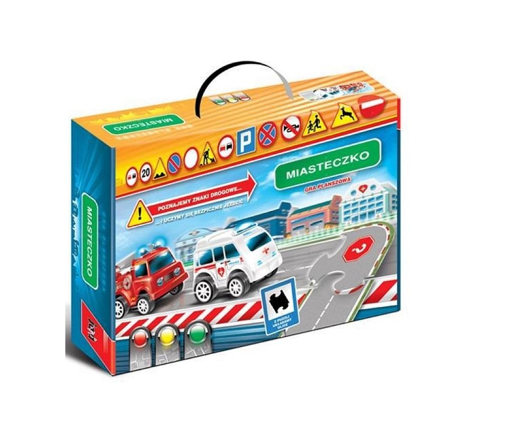 Gra dla 2 do 4 graczy w wieku od lat 4 do 104. Miasteczko jest grą składającą się z puzzli „uliczek”, po których gracze poruszają się samochodami służb miejskich zgodnie z przepisami ruchu drogowego. Przed grą kierowcy łączą elementy puzzli i tworzą uliczki. Do gry dołączone są makiety budynków, które wizualizują miejsce akcji. Rolę kostki pełni prędkościomierz z sygnalizatorem . Na niektórych polach umiejscowione są pola ze znakiem "?" lub "!" , które zobowiązują gracza do wylosowania karty z odpowiedniej talii i wykonania zadania. Na kartach znajdują się podstawowe znaki drogowe oraz ich objaśnienia . Każde wykona-nie zadania z Kart Znaków Drogowych oraz Kart Przygód Drogowych wzbogaca początkującego kierowcę o doświadcze-nie i pozwala pozbyć się kartonika z "Zielonym Listkiem". Wygrywa ten , kto pozbędzie się wszystkich kartoników z "Zielonym Listkiem" i pierwszy dotrze na metę, czyli sprawnie i zgodnie z przepisami ruchu drogowego przejedzie uliczkami Miasteczka .