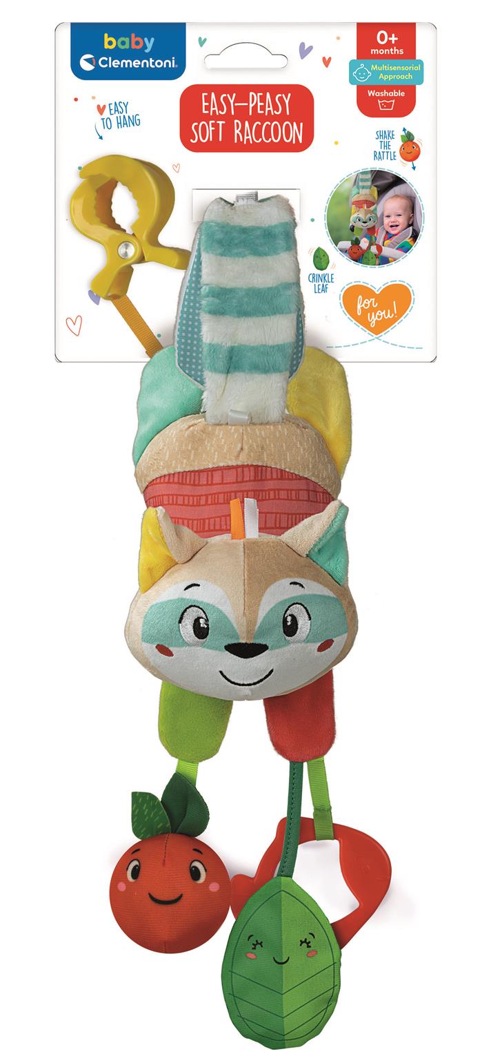 Plastikowe kółeczko i praktyczny zacisk umożliwiają powieszenie zabawki w dowolnym miejscu.