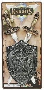 W zestawie: 2 x miecz, tarcza, Pozostałe informacje: dł. miecza 49 cm, tarcza 28 x 20 cm, wym. opak. 55,5 x 26 cm, 3+