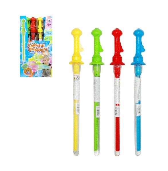 Zestaw baniek mydlanych pod postacią kolorowego miecza. Towar dostępny w kilku wersjach, wybierany losowo. Cena dotyczy jednej sztuki. Produkt dla dzieci od 3 lat.