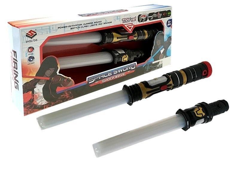Miecz Świetlny Podwójny 2w1 Miecz Świetlny to jedna z najbardziej legendarnych broni ze świata science-fiction. Wielu młodych fanów kosmicznych przygód marzy o takim narzędziu. Co jest jednak fajniejsze od miecza świetlnego? Dwa miecze świetlne! Albo, co jeszcze lepsze - podwójny miecz świetlny! Zestaw, który mają państwo okazję zakupić składa się z dwóch mieczy - dłuższego, przeznaczonego do używania w głównej ręce oraz krótszego, lżejszego, dla drugiej lewej. Za pomocą łączeń w końcówkach rękojeści można je połączyć w jeden miecz z dwoma ostrzami! Miecze za pomocą przycisku świecą się, a także wydają odgłosy walki. Dzięki tym funkcjom Twoje dziecko będzie w stanie odgrywać sceny ze swoich ulubionych filmów sci-fi! Miecze mają wbudowane 3 kolory: czerwony, niebieski i fioletowy, które zmieniają się po naciśnięciu przycisku na rączce. Wymiary opakowania: 46 cm x 20 cm x 5,5 cm
