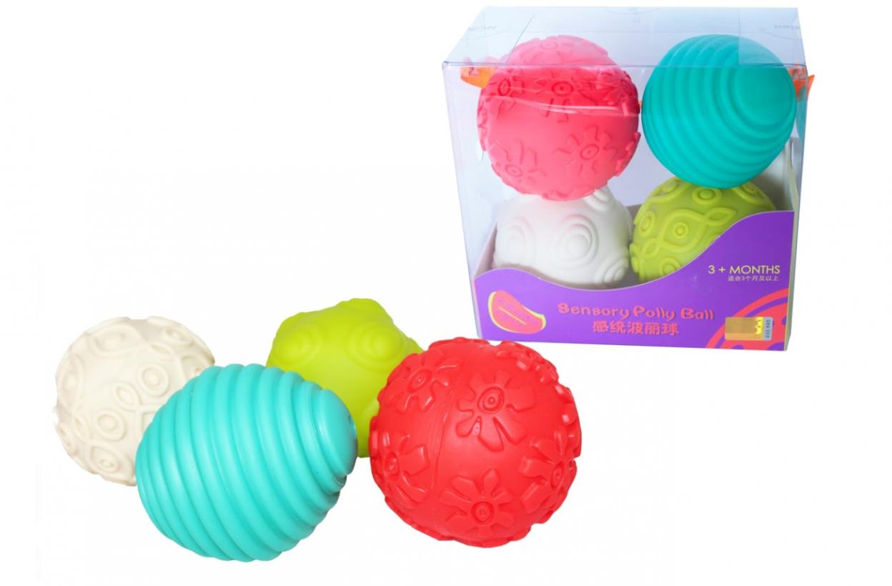 Miękkie kule sensoryczne. W opakowaniu cztery sztuki i każda ma inną strukturę, pomaga dziecku w zapoznaniu się ze zmysłem dotyku.