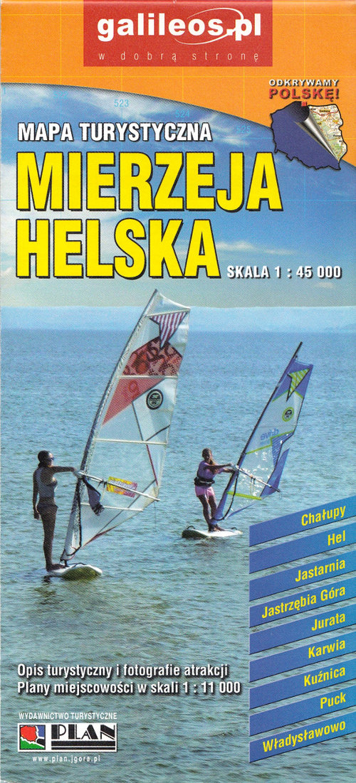 Turystyczna mapa Mierzei Helskiej i okolic w skali 1:45 000 z aktualnymi szlakami pieszymi i rowerowymi. Na rewersie strony umieszczono opis turystyczny z dokładnymi planami: Jastarni, Władysławowa, Kuźnicy, Helu, Juraty, Jastrzębiej Góry, Karwi, Chałup, Juraty i centrum Pucka w skali 1:11 000