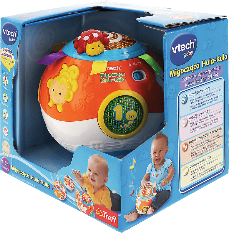 Migocząca Hula-Kula to interaktywna zabawka stworzona z myślą o dzieciach, które zaczynają stawiać pierwsze kroki i badać otaczający je świat. Mechanizm samoczynnie wprawiający Kulę w ruch zachęca dziecko do stawiania pierwszych kroków i podążania za wesołymi dźwiękami i światełkami. Po naciśnięciu świecących guzików z cyferkami i zwierzątkami, dziecko usłyszy przyjazne melodie i piosenki, a także zapozna się z podstawowymi kolorami i kształtami. Wypukłe kształty zwierzątek, biedroneczka kręcąca kółeczka i kolorowe tasiemki zapewniają dodatkowe wrażenia dotykowe oraz rozwój koordynacji wzrokowo-ruchowej, dostarczając przy tym wiele radości. Produkt doceniony i nagradzany przez rodziców i ekspertów branży dziecięcej. Polska wersja językowa Migoczące przyciski z cyferkami i wesołe melodie Samoczynne wprawianie w ruch Funkcja automatycznego wyłączania oszczędza baterie 2 poziomy głośności Funkcjonalne i trwałe wykonanie Rozwija wyobraźnię, wspomaga rozwój sensoryczny i umiejętności motoryczne Zachęca do poznawania świata