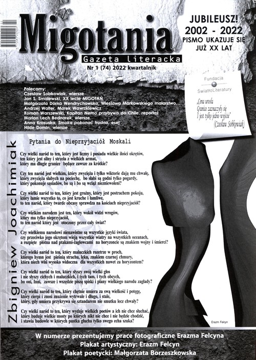 Gazeta Literacka "Migotania” to w każdym numerze nawet do ponad 100 stron w dużym formacie 31 na 22 cm, co odpowiada ok. 300 stronom A-5. To każdorazowo szeroka prezentacja grafiki i fotografiki, to bardzo atrakcyjny wygląd i ciekawe intelektualnie treści, to plakat poetycki oraz plakat graficzny, to formuła pisma unikatowa w Polsce i skali światowej. To w ciągu 19 lat istnienia blisko tysiąc autorów. To grupa redaktorów z Gdańska i Warszawy, Cincinnati i Nowego Jorku, Łodzi i Szczecina, z najróżniejszych środowisk. W numerze 4 (73) 2021 m. innymi: proza Mariana Pilota, Dzienniki Anny Frajlich, zdjęcia Wojsława Brydaka,Canto IV Ezry Pounda, Dziennik Mariana Kisiela, liczne recenzje, eseje: Urszuli Małgorzaty Benki, Andrzej Leszczyńskiego, Janusza Taranienki, plus prezentacje poetyckie.