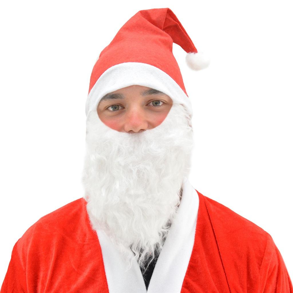 Elementy przebrania Mikołaja. Czapka o wymiarze: 36,5 x 29 cm z doczepianą brodą o długości: 25 cm.
