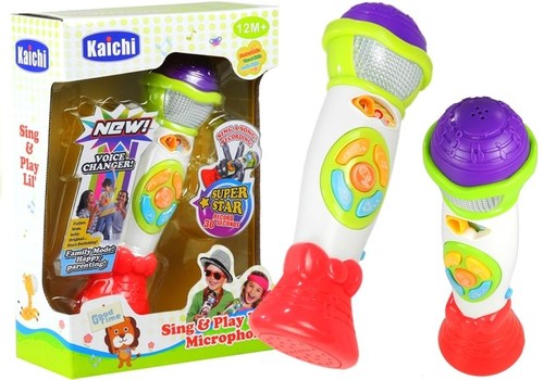 Doskonała okazja do rozwijania umiejętności wokalnych dziecka. Świetna zabawa gwarantowana przy śpiewaniu i nagrywaniu swoich ulubionych piosenek. Zabawa w gwiazdę estrady rozwija słuch, umiejętności muzyczne i rytmiczne dziecka. Kolorowa zabawka wzbudza zainteresowanie dziecka. Funkcje zabawki: - nagrywanie i odtwarzanie piosenek - 4 rodzaje efektów dźwiękowych zmieniających głos - efekty świetlne -wgrane melodyjki Wciskając przycisk z pierwszą nutką usłyszymy: śmiech, gaworzenie dziecka, owacje, brawa. Wciskając drugi przycisk z nutkami usłyszymy: melodyjki.