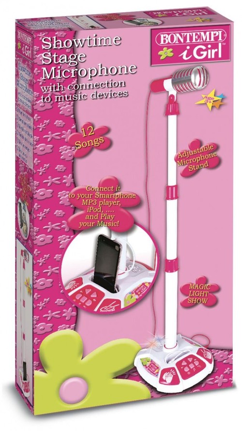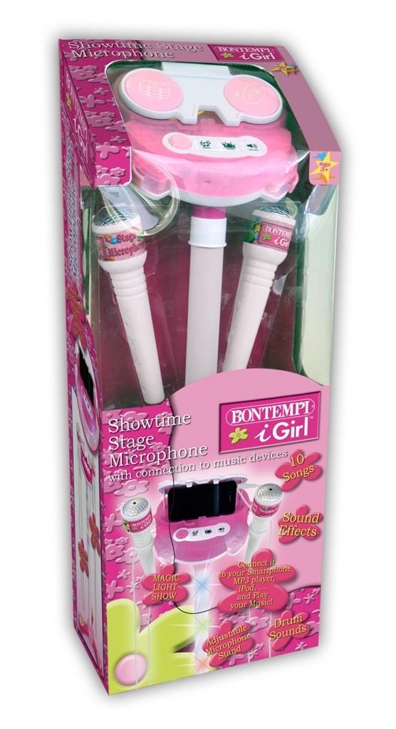 Dwa mikrofony sceniczne na regulowanym statywie włoskiej firmy Bontempi. Instrument posiada 10 wgranych podkładów demo oraz efekty aplauzu i perkusji. Po wybraniu odpowiedniego przycisku możliwe jest uruchomienie także efektów świetlnych. Dzięki wbudowanemu kablowi możliwe jest podłączenie do odtwarzacza mp3 (np. do smartfona). Wymiary produktu to 22 x 12,5 x 58,5 cm.
