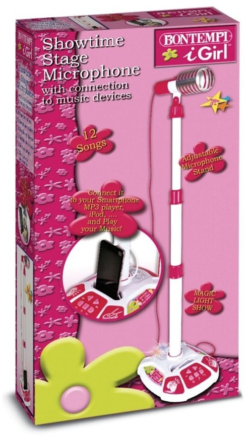 Mikrofon ze statywem Bontempi. Zabawka ma wgrane melodie, efekt dźwiękowy aplausu, efekty świetlne. Regulowany statyw do wysokości 1100 mm, funkcję automatycznego wyłączania oraz opcję podłączenia do urządzeń jak: MP3 odtwarzacz, iPod, Smartphone. Regulowany statyw do wysokości 1130 mm. Wymiary produktu 34 x 21 x 111cm. Zasilanie 3xR6/AA 1,5V (nie dołączono do zestawu).