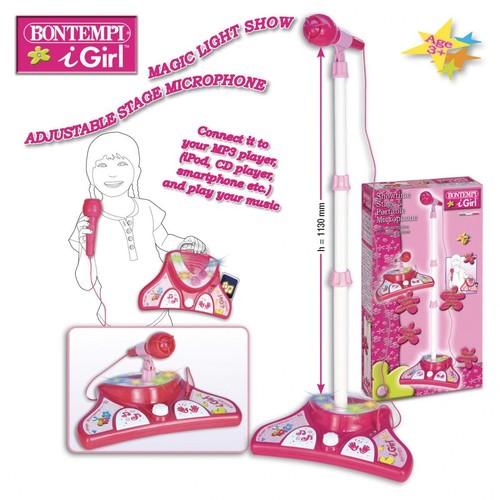 Mikrofon ze statywem Bontempi. Zabawka ma wgranych 6 melodii, efekt dźwiękowy braw, efekty świetlne, funkcję automatycznego wyłączania oraz opcję podłączenia do urządzeń jak: MP3 odtwarzacz, iPod, Smartphone … Regulowany statyw do wysokości 1130 mm. Zasilanie 4xR6/AA 1,5V (nie dołączono do zestawu). Dla dzieci w wieku od 4 lat