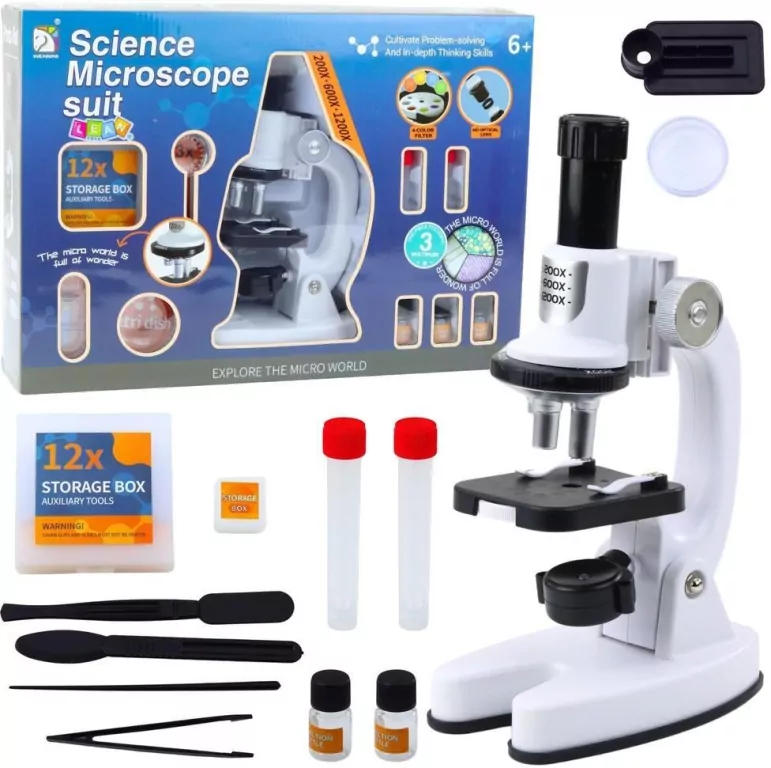 MIKROSKOP EDUKACYJNY LED 1200X Z ZESTAWEM NAUKOWYM Mikroskop edukacyjny LED 1200x to świetna propozycja dla dzieci, które chcą odkrywać tajemnice świata przyrody i zgłębiać fascynujący mikroświat. To idealny zestaw startowy, który pozwala stworzyć własne domowe laboratorium i rozwijać zainteresowania naukowe już od najmłodszych lat. Dzięki możliwości trzystopniowego powiększenia (200x, 600x, 1200x), dzieci mogą prowadzić obserwacje komórek, tkanin, owadów i wielu innych struktur. Podświetlenie LED zapewnia wyraźny i jasny obraz, a ergonomiczna konstrukcja sprawia, że użytkowanie mikroskopu jest komfortowe nawet przy dłuższej pracy. W zestawie znajduje się szereg niezbędnych narzędzi - pipeta, pęseta, próbki, fiolki, pojemniki i szkiełka - które umożliwiają przeprowadzenie wielu interesujących eksperymentów i obserwacji. Całość zamknięta w solidnym opakowaniu, idealnym na prezent. SPECYFIKACJA: Wymiary mikroskopu: 25 x 15 cm Wymiary opakowania: 42 x 29 x 9,5 cm Powiększenie: 200x, 600x, 1200x Podświetlenie: LED Kolor: biały Materiał: tworzywo sztuczne Zastosowanie: edukacja, zabawa, nauka obserwacji ZAWARTOŚĆ ZESTAWU: Mikroskop edukacyjny z podświetleniem LED Plastikowa pipeta, pęseta, łopatka, nóż i patyczek 12 szkiełek podstawowych i 12 nakrywkowych Lupa 2 próbki tkanin 3 buteleczki i 2 fiolki Pudełka na próbki (owalne i okrągłe) Pudełko do przechowywania akcesoriów Mata antypoślizgowa Instrukcja i materiały edukacyjne