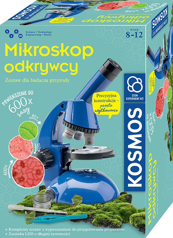 Mikroskop posiada 3 powiększenia: x60, x150, x600. W środku znajduje się instrukcja w języku polskim.