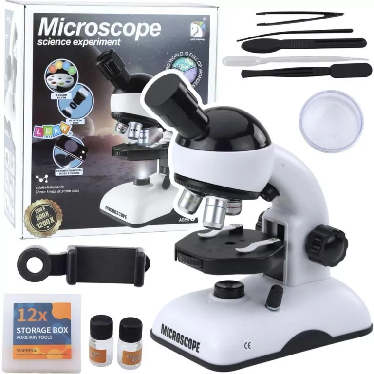 MIKROSKOP EDUKACYJNY Z UCHWYTEM NA TELEFON I ZESTAWEM AKCESORIÓW Niezwykły mikroskop edukacyjny to idealne narzędzie dla młodych odkrywców i pasjonatów nauki. Oferuje trzy poziomy powiększenia - 200x, 600x oraz aż 1200x, dzięki czemu umożliwia precyzyjne badanie mikroskopijnych struktur i detali niewidocznych gołym okiem. To kompletne laboratorium w zasięgu ręki, które pozwala na eksplorowanie fascynującego mikroświata. Wbudowane światło dolne LED umożliwia podświetlanie przezroczystych preparatów, natomiast górne światło LED pozwala na obserwację nieprzezroczystych obiektów. Zastosowane kolorowe filtry świetlne dodatkowo zwiększają komfort i atrakcyjność obserwacji. W zestawie znajduje się również specjalny uchwyt na telefon, który umożliwia montaż smartfona nad okular mikroskopu - pozwala to na robienie zdjęć preparatów oraz dzielenie się obserwacjami z innymi. Dodatkowe akcesoria - w tym pincety, szkiełka, próbki i narzędzia laboratoryjne - zapewniają pełną gotowość do pierwszych eksperymentów. Zaprojektowany z myślą o dzieciach i początkujących badaczach, mikroskop jest łatwy w obsłudze, solidny i inspirujący, idealny do nauki biologii, chemii, fizyki czy po prostu odkrywania otaczającego świata w skali mikro. SPECYFIKACJA: Typ urządzenia: mikroskop edukacyjny Powiększenia: 200x, 600x, 1200x Oświetlenie: LED dolne i górne Filtry: kolorowe, podświetlenie dolne Zasilanie: 2 x bateria AA 1,5V (brak w zestawie) Wymiary opakowania: 29 x 25,5 x 11 cm Materiał: tworzywo sztuczne + elementy optyczne ZAWARTOŚĆ ZESTAWU: 1 x mikroskop edukacyjny 1 x uchwyt na telefon 2 x pojemniczki na próbki 1 x pudełko z narzędziami 12-elementowe 1 x pinceta 1 x igła preparacyjna 1 x szpatułka 1 x szkiełka 1 x pojemniczek laboratoryjny