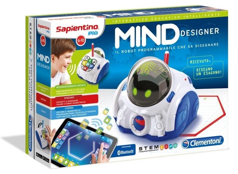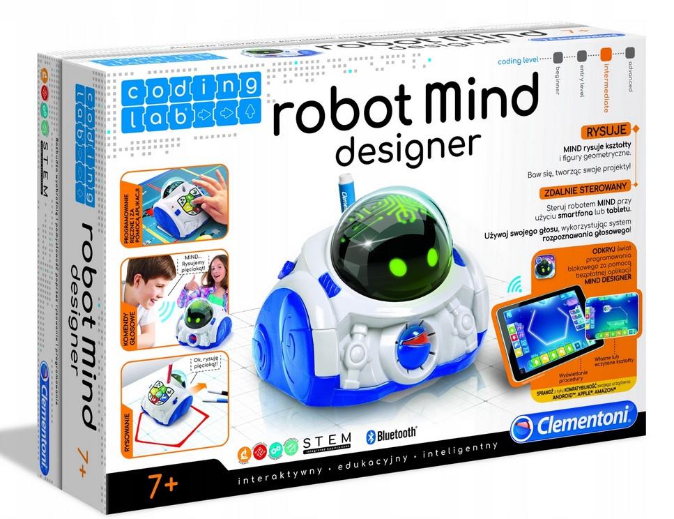 Robot interaktywny, edukacyjny, inteligentny. Rozbudza wyobraźnię i pomysłowość poprzez rysowanie i programowanie. Zdalnie sterowany - steruj robotem Mind przy użyciu smartfona lub tabletu. Rysuje - dzięki precyzyjnym slnikom Mind rysuje kształty i figury geometryczne. Baw się, tworząc swoje projekty. Inteligentny - ukończ zadania matematyczne, grając na żółtej planszy. Mind rozpoznaje własną pozycję i reaguje na polecenia. Zawartość: robot Mind designer plansza dwustronna 3 pisaki 10 arkuszy A3 kolorowa instrukcja. Wiek 7+