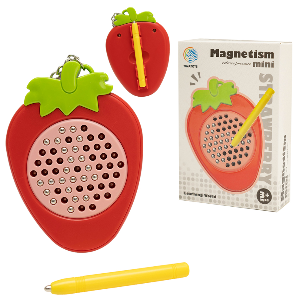 Mini magnetyczna tablica do rysowania - Truskawka Kolorowa mini tablica magnetyczna w kształcie truskawki to poręczna zabawka sensoryczna dla dzieci od 3. roku życia. Dzięki magnetycznemu rysikowi dziecko może wyciągać kuleczki z wnętrza tablicy i tworzyć proste wzory lub obrazki. Wystarczy przejechać rysikiem po powierzchni, a srebrne kuleczki wyskoczą na wierzch i zostaną w miejscu dzięki sile magnesu. Zalety zabawki: działa jak wyciszający antystres - pomaga rozładować emocje i napięcie, rozwija motorykę małą i precyzję ruchów dłoni, stymuluje koordynację oko-ręka, zachęca do kreatywnej zabawy i ćwiczenia koncentracji, idealna do zabrania w podróż, do plecaka, do przedszkola - kompaktowy rozmiar i wygodna zawieszka W zestawie: - mini tablica magnetyczna w kształcie truskawki - magnetyczny rysik - zawieszka do plecaka Wymiary produktu: 7.7 x 2.4 x 10.9 cm Wymiary opakowania: 7.6 x 2.6 x 11.5 cm Wiek 3+