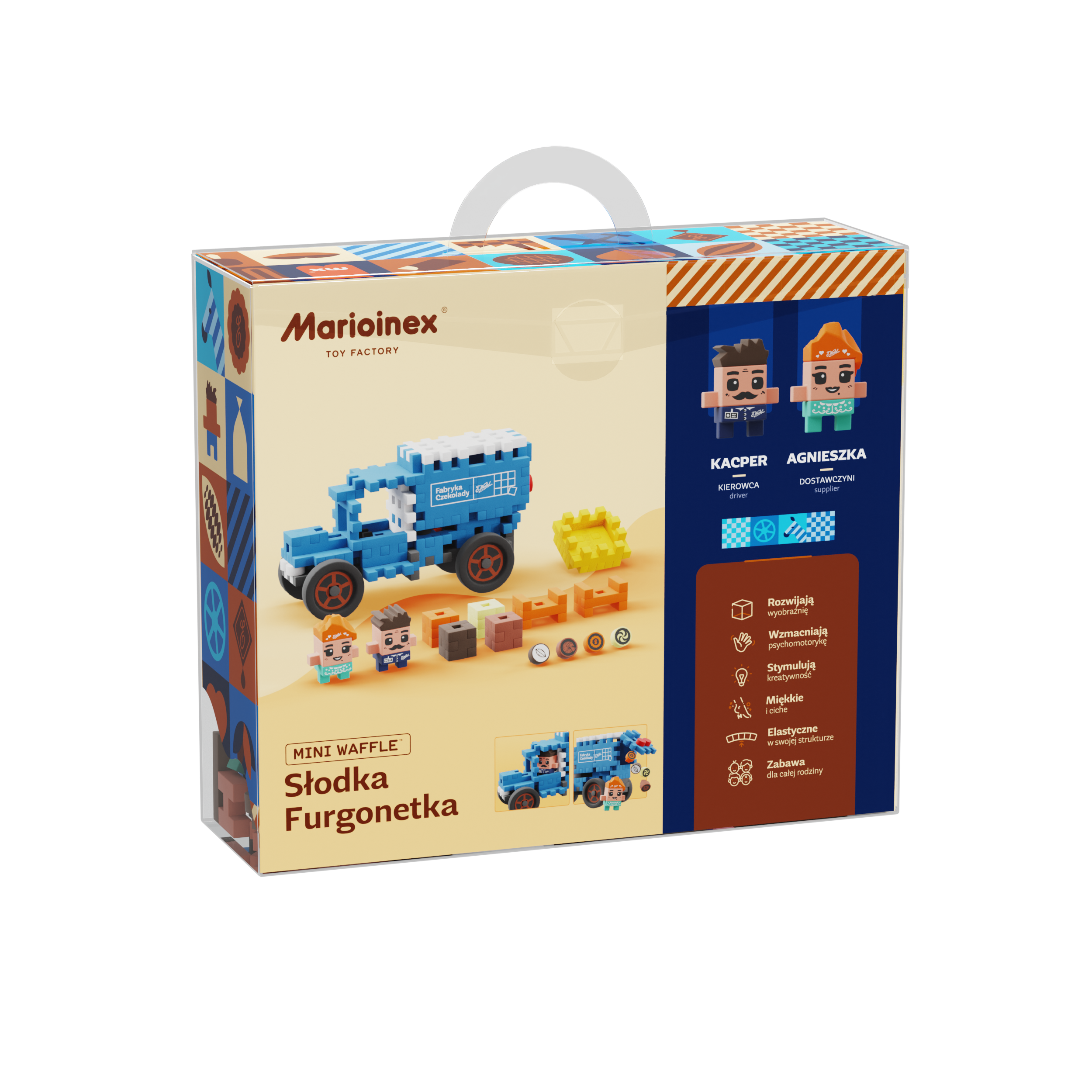 Własnoręcznie zbuduj furgonetkę dostawczą i zasiądź za jej kierownicą wraz z dostawcą Kacprem. Ze 100 elementów wraz ze swoją pociechą stworzycie furgonetkę Wedla, palety i stoisko dla sprzedawczyni Agnieszki. W zestawie znajdziesz także klocki, które są odpowiednikami ulubionych produktów klientów Wedla.