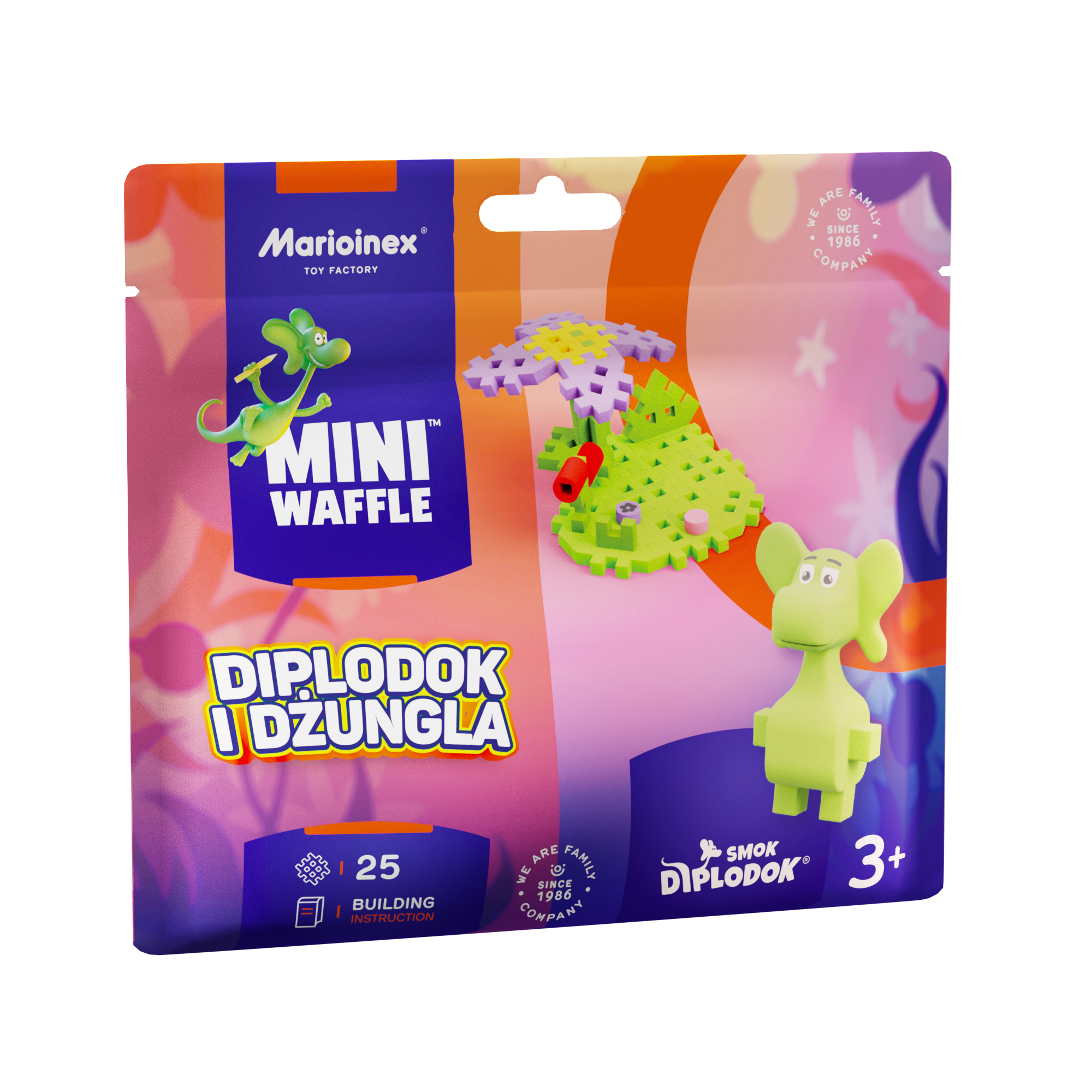 Zestaw Diplodok i Dżungla z serii Mini Waffle to 25 elementów, z których stworzysz fragment z drzewem i kwiatami, oraz figurką przezabawnego smoka Diplodoka. To urocze stworzenie bez przerwy chce przeżywać przygody i odkrywać nowe kawałki świata I chce to robić właśnie z Tobą!