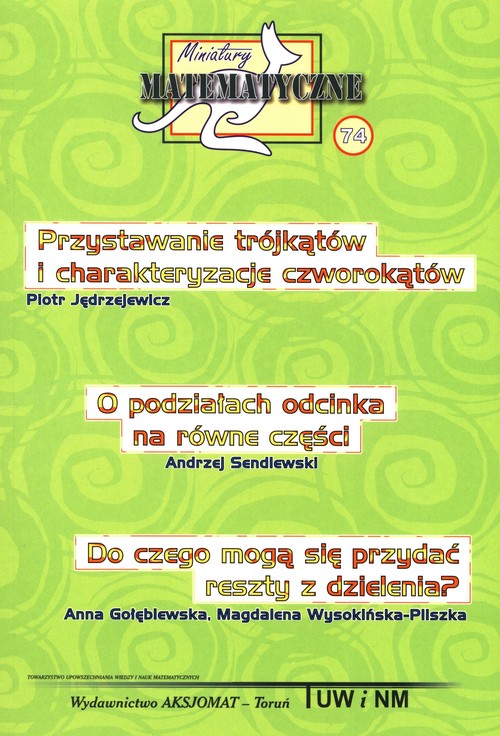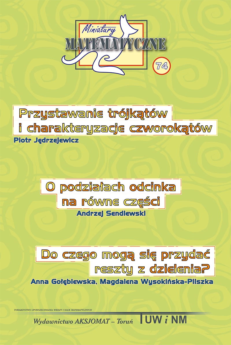 W roku 2021 odbyła się XXX edycja Międzynarodowego Konkursu „Kangur Matematyczny” w Polsce. Była to więc edycja jubileuszowa — możemy być dumni z tego jubileuszu, bo Polska dołączyła do konkursu już w rok po Francji — ojczyźnie Kangura Matematycznego. Edycji tej (podobnie jak poprzedniej) towarzyszyły bardzo trudne warunki zewnętrzne: zamknięte szkoły, utrudniona komunikacja, rozliczne restrykcje uniemożliwiające, a co najmniej utrudniające, normalne życie. Przeprowadzenie konkursu jako takiego nie było łatwe, ale dzięki ogromnej, bezinteresownej pracy nauczycieli, życzliwości dyrektorów szkół, rodziców i samych uczniów udało się osiągnąć cel. Komitet Organizacyjny Konkursu przygotował dla uczczenia jubileuszu publikację „wspomnieniową” przeznaczoną dla uczniów najstarszych klas szkół podstawowych. W niniejszej broszurze zawarliśmy trzy publikowane przed laty miniatury matematyczne, uznane przez członków Komitetu za na tyle interesujące, by po latach przypomnieć je uczniom, którzy nie mieli wielkich szans, by zgłębić ich treść. W miniaturze pierwszej autor zgłębia zawiłości tak zdawałoby się prostego pojęcia jak przystawanie trójkątów. Przedstawia w niej precyzyjną definicję tytułowego pojęcia, następnie przypomina znane ze szkoły cechy przystawania. W dalszej treści przytacza inne cechy, które niekoniecznie są używane w edukacji szkolnej. Na zakończenie artykułu autor przenosi wyniki i na czworokąty, co jest zapewne dla wielu uczniów nowością. Czytelnik dowie się, jak można wykorzystywać podstawowe, znane ze szkoły cechy przystawania trójkątów do opisu i klasyfikacji niektórych czworokątów — równoległoboku, trapezu równoramiennego, deltoidu. Rozumowania zaprezentowane w tej miniaturce to czysta logika — świetna szkoła ćwiczenia umysłu, kształtowania zdolności i wdrażania dyscypliny intelektualnej. Druga miniatura również ma charakter geometryczny. Poświęcona jest konstrukcyjnym metodom podziału odcinka na równe części, przy czym przez termin „konstrukcyjny” rozumie się konstruowalność w sensie Platona, czyli za pomocą cyrkla i linijki. Jakkolwiek metody„platońskiego” podziału odcinka na równe części zostały opracowane już w starożytności, a dzięki twierdzeniom sformułowanym przez Talesa z Miletu (żył w latach 620-540 przed Chrystusem), stały się znane nawet uczniom szkół podstawowych, prezentowane w tym artykule sposoby podziału są nietypowe i mało znane. Istotną cechą tych metod jest ich charakter rekurencyjny: jeżeli umiemy podzielić odcinek na n części, to umiemy też podzielić go na n ` 1 części. Właściwość ta wprost zachęca do zastosowania komputera — charakter rekurencyjny ułatwia zaprogramowanie konstrukcji i wykonania jej z zastosowaniem technologii informacyjnych. Miniatura trzecia, w odróżnieniu od dwóch pierwszych, ma charakter lekkiej gawędy na temat praktycznych pożytków sztuki dzielenia z resztą. Czytelnik dowie się z niej m.in, jak może zaimponować kolegom, naśladując magików odgadujących, jakiej karty brakuje w talii. Autorki opisują kilka takich sztuczek, których tajemnica leży właśnie we własnościach dzielenia z resztą. Jednak nie tylko sztuczki karciane znajdują się w tym miłym do czytania tekście. Jeden z rozdziałów miniatury ma tytuł „W jaki dzień tygodnia wypadną Twoje setne urodziny”. Tak, to rozdział o tzw. kalendarzu stuletnim. Jest on nieco trudniejszy od poprzedniego, ale wielce pouczający — w kalendarzu też ukrywają się reszty z dzielenia. Na zakończenie lektury Czytelnik dowie się, dlaczego kasjerka w kasie sklepowej, która ręcznie wpisuje uszkodzony kod towaru, nie myli się w tym długim rządku cyfr ze szkodą dla kupującego. Przy okazji Czytelnik zaznajomi się z, jakże obecnie ważnym, pojęciem cyfry kontrolnej.