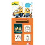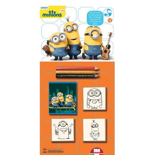 Zestaw pieczątek z serii Minionki Zawartość: 3 drewniane pieczątki 3 kredki ołówkowe pudełko z nietoksyczynm tuszem Zabawka dla dzieci w wieku 3+