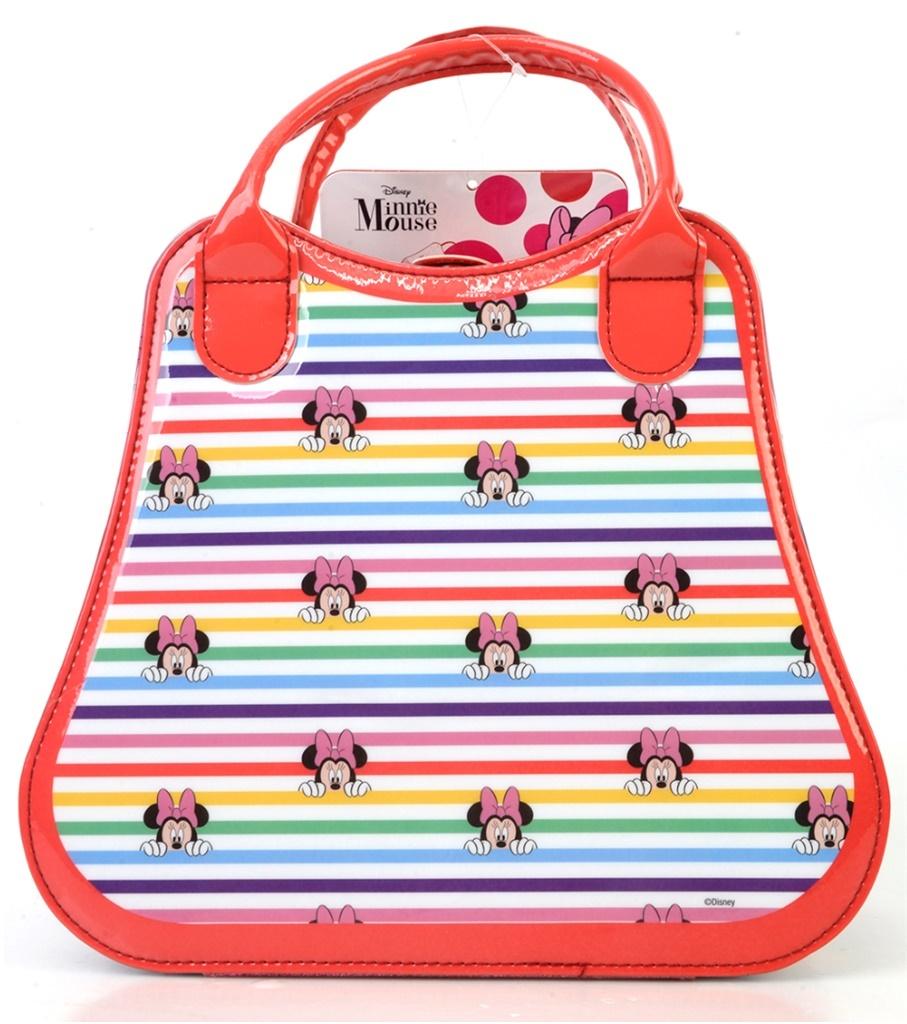 Torebka z kosmetykami dla dzieci Minnie Torebka jest pełna kosmetyków i akcesoriów dopasowanych do dziewczyny, która kocha swój makijaż! Zawartość: 1 grzebień, 1 pilnik do paznokci, 2 aplikatory gąbkowe, 2 szczotki do ust, 1 szczotka do makijażu, 1 lustro, 3 balsamy do ust, 2 separatory do paznokci, 2 spinki do włosów, 4 błyszczące proszki, 3 lakiery do paznokci, 2 błyszczyki, 2 pierścienie