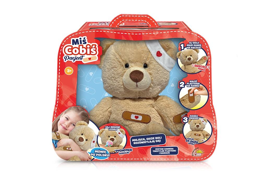Interaktywny Miś, który potrzebuje opieki i przytulenia! Na ciele Misia w różnych miejscach pojawiają się ranki, które świecą i jednocześnie Miś mówi co mu dolega. Wystarczy przyłożyć na rankę plasterek lub bandaż, ranka zniknie, a Miś poczuje się lepiej o czym nam powie. Ranki pojawiają się na rączce, nóżce, główce, brzuszku i stopie Misia. Gdy na ciele misia pojawia się wszystkie ranki i nałożymy na nie plasterki lub bandaże, Miś poczuje się zdecydowanie lepiej i poprosi o zdjęcie wszystkich opatrunków. Możemy zacząć zabawę od początku. Kolejność pojawiania się ranek za każdym razem może być inna. Miś mówi po polsku. Zawartość opakowania: 1 Miś, 3 plasterki, 2 bandaże, 1 lizak. Baterie: wymaga zastosowania baterii 3x AAA(baterii nie załączono).