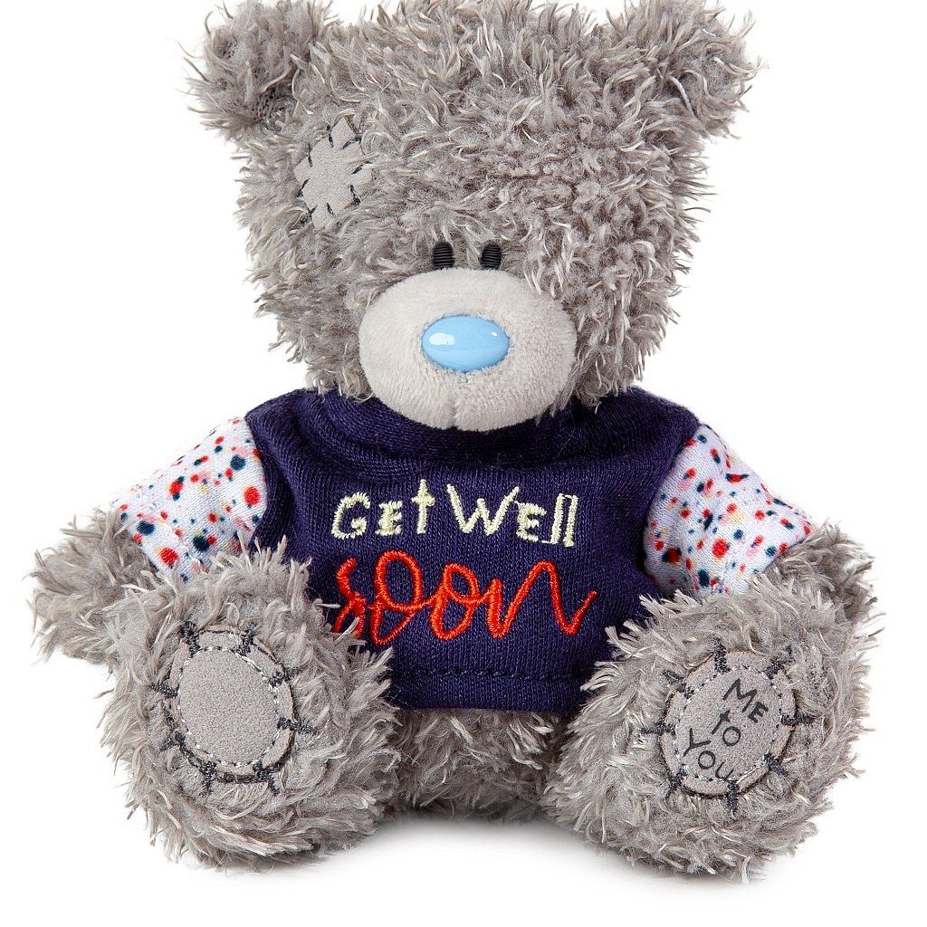 Przekaż bliskiej osobie życzenia szybkiego powrotu do zdrowia z tym uroczym 11-centymetrowym misiem Me to You! Ten miękki i słodki miś ma na sobie koszulkę z napisem „Get well soon” (Wracaj do zdrowia wkrótce).