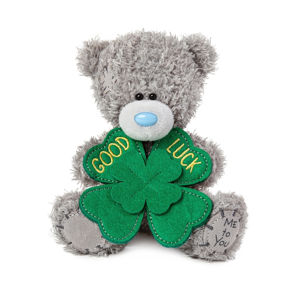 Życz komuś powodzenia z tym uroczym 13 - centymetrowym misiem Me to You! Ten miękki i słodki miś trzyma zieloną 4-listną koniczynę z napisem „Good Luck”